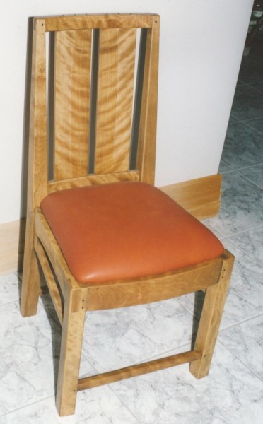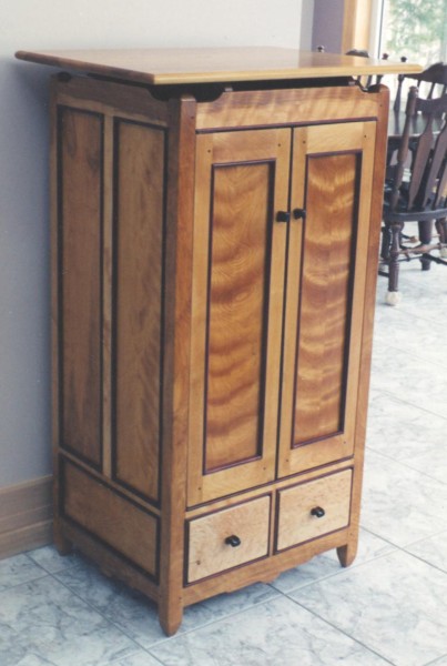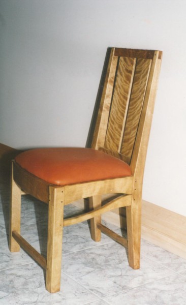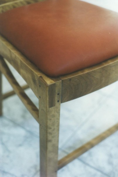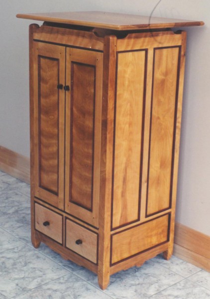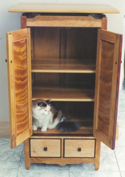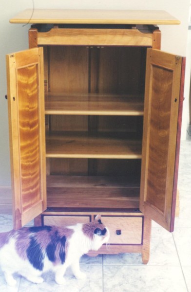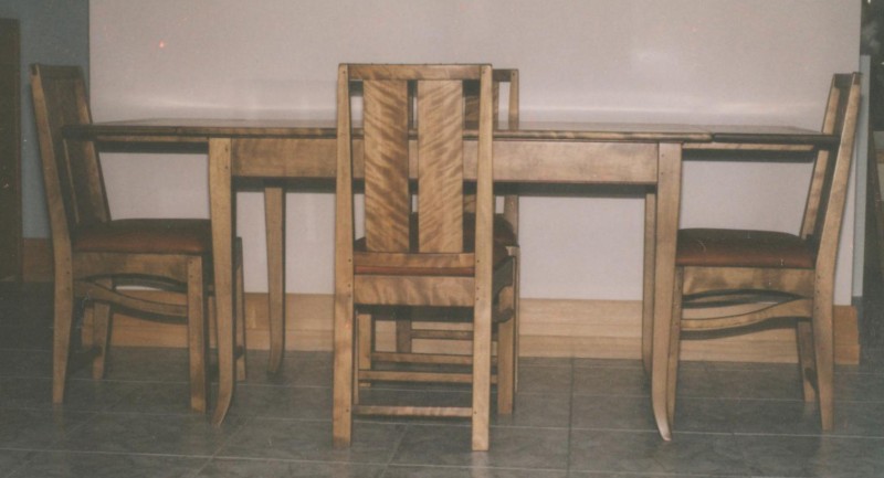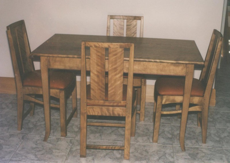 « Les essences de bois employées pour mes créations sont principalement le merisier, le cerisier, l'érable, l'amarante et l'ébène. À cela peut s'ajouter toute la gamme des bois disponibles. J'ai une nette préférence pour le merisier frisé que je sélectionne moi même au moment du sciage que je fais avec l'aide d'un ami qui possède un moulin à scie. Le bois est ensuite séché pendant un an à l'air libre et le séchage final se fait dans un séchoir maison. »